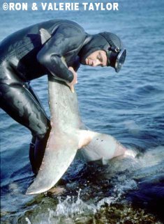 Ron: As far as I know we were the first to dive with Great Whites without a cage when shooting Blue Wilderness series at Dyer Island in South Africa. Our cage had been lost during a storm, so we had no choice. Four of us went in with the Whites, Valerie, myself, George Askew and another South African who's name escapes me at the moment. I had dived previously with Whites outside the cage in South Australia, but no more than 5-10 meters from the cage.