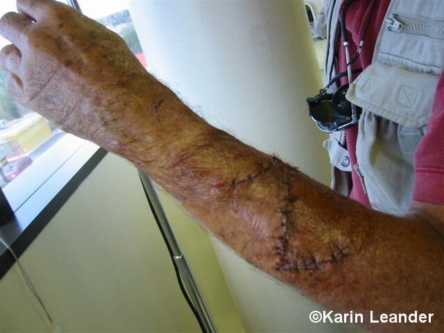 Eventually I made it to the harbour where I was given lifesaving first aid treatment. Since I take blood thinners due to a cardiac problem, it was difficult to stop the bleeding. I had lost so much blood that I was about to pass out once I laid on the stretcher. It took 42 stitches, including 8 internal ones to repair the severed muscles.